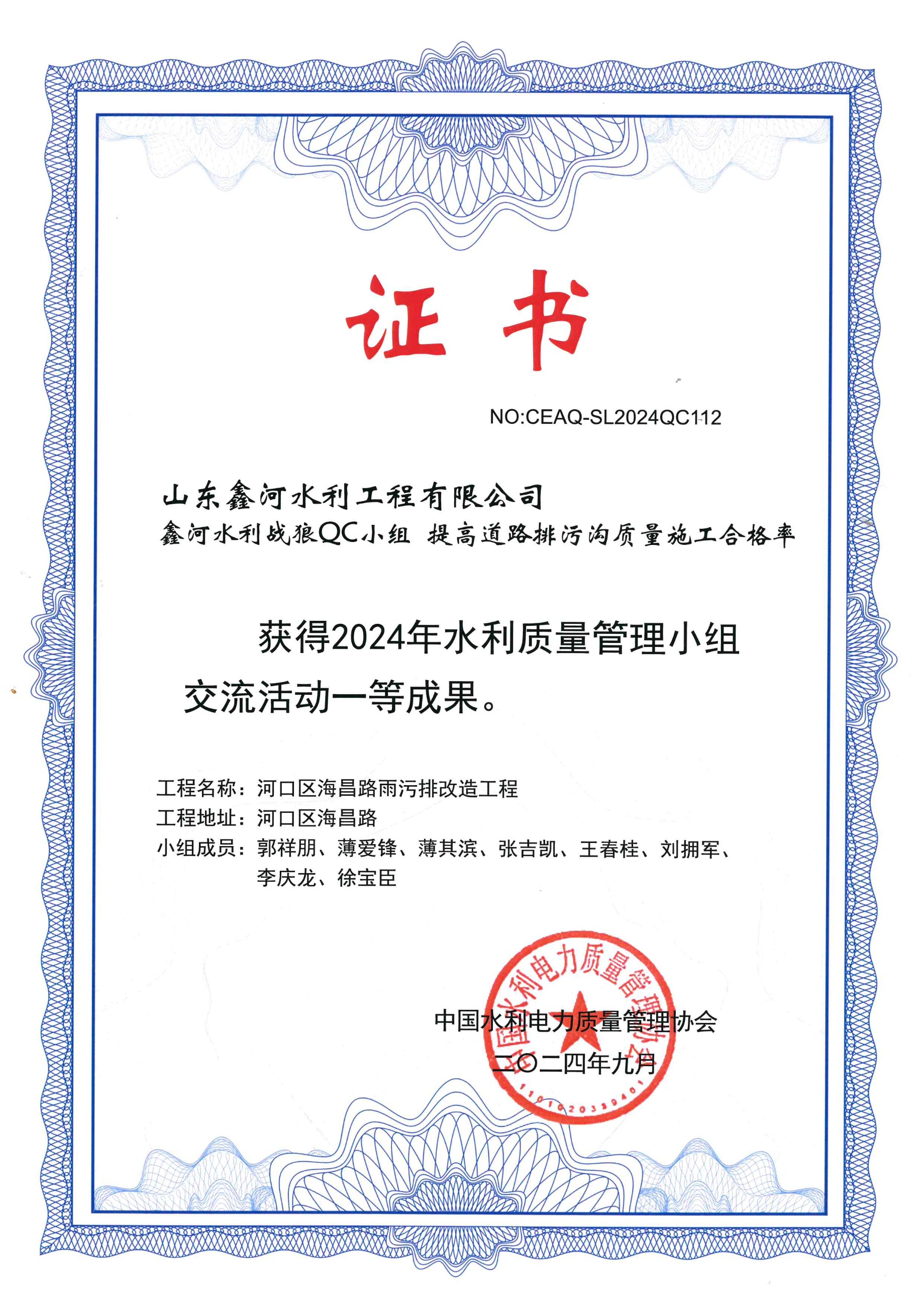 QC成果“提高道路排污溝質(zhì)量施工合格率”中國(guó)水利電力質(zhì)量管理協(xié)會(huì)一等成果(2024年9月)