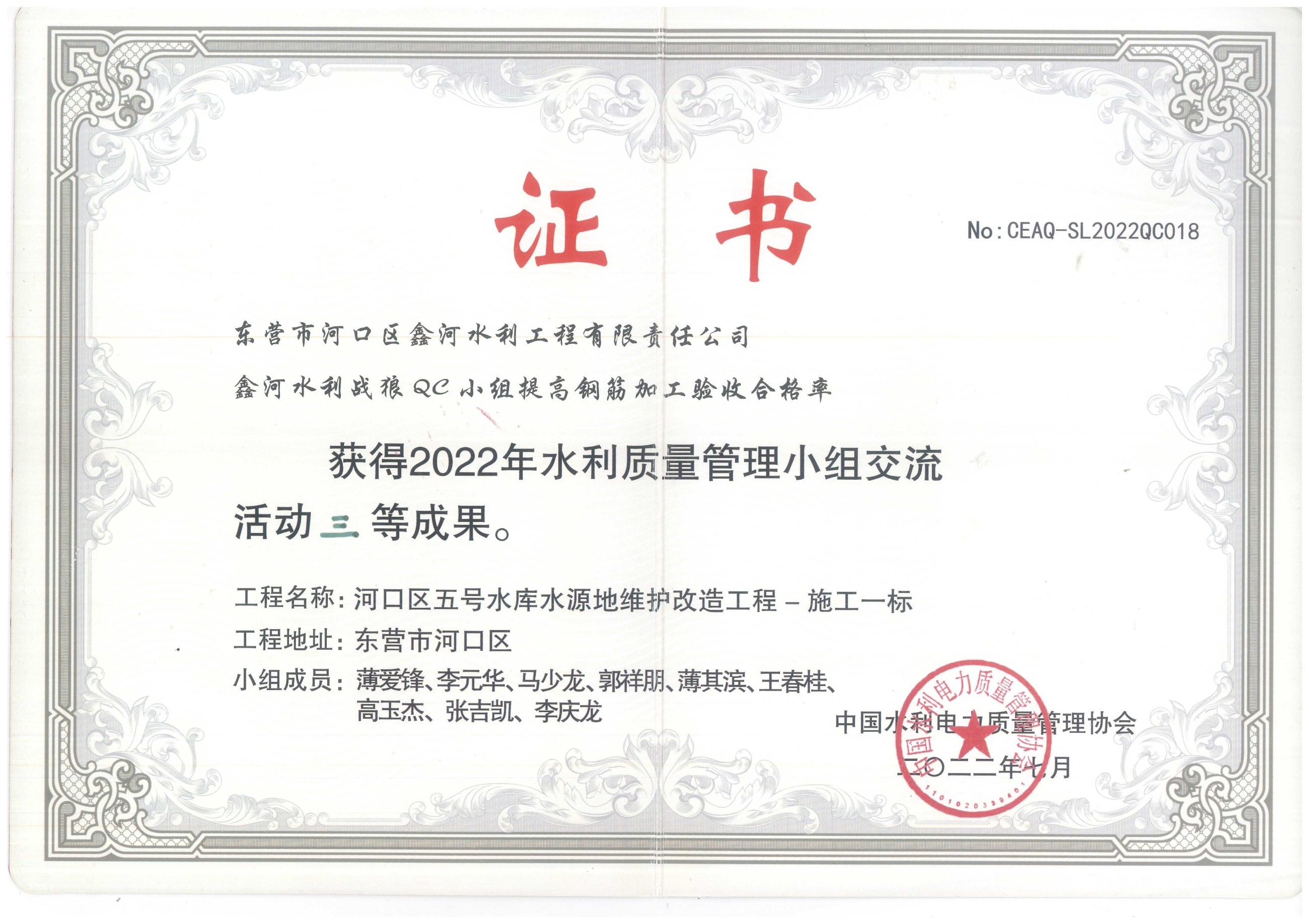 2022年7月公司鑫河水利戰(zhàn)狼QC小組申報的課題“提高鋼筋加工驗收合格率”獲中國水利電力質(zhì)量管理協(xié)會三等成果。